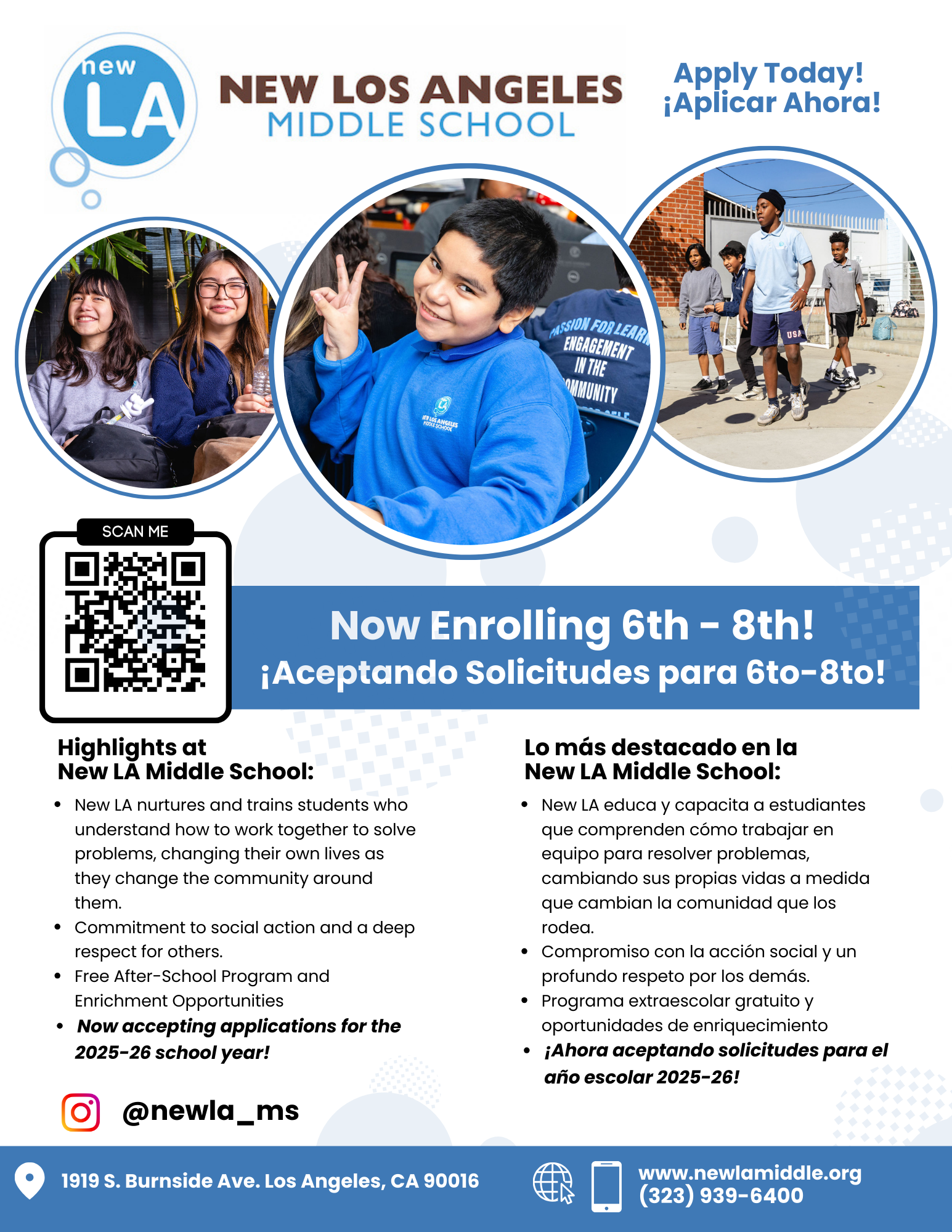 Admission to New LA is open to any resident of the state of CA. New Los Angeles Charter School admits all pupils who wish to attend up to capacity. No test or assessment shall be administered to students prior to acceptance and enrollment into the school. There are no requirements for enrollment. New LA does not charge students tuition and does not discriminate against any student on the basis of ethnicity, national origin, gender or disability. New LA ensures that the unique needs of students with disabilities are met in order to give students with disabilities access to the same educational programs and/or activities that are available to their nondisabled peers. Applicants must be entering 6th, 7th, or 8th grade in August 2026.